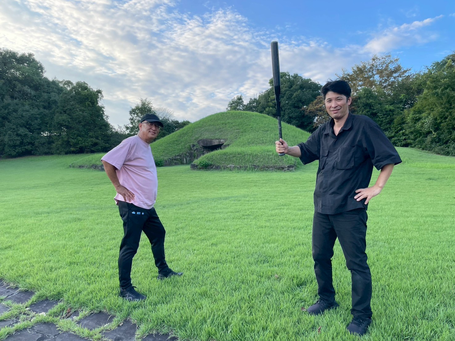 ロケの途中に史跡で野球? え~、大丈夫?
